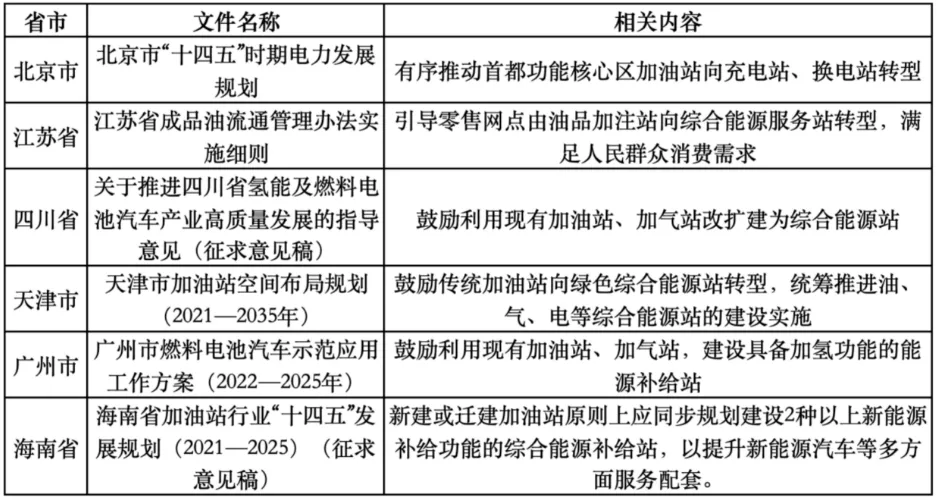 新能源汽車成為交通領(lǐng)域落實“雙碳”戰(zhàn)略和保障國家能源安全的重要抓手,國家發(fā)展改革委、國家能源局《關(guān)于完善能源綠色低碳轉(zhuǎn)型體制機制和政策措施的意見》《關(guān)于加快推進充電基礎(chǔ)設施建設 更好支持新能源汽車下鄉(xiāng)和鄉(xiāng)村振興的實施意見》等文件及北京、江蘇、四川、天津、廣州等地,均鼓勵傳統(tǒng)加油站、加氣站建設綜合能源站。同時,北京市發(fā)布《北京市加油站設置新能源設施安全生產(chǎn)管理工作指引》,率先明確加油站設置充換電設施的安全技術(shù)要求。