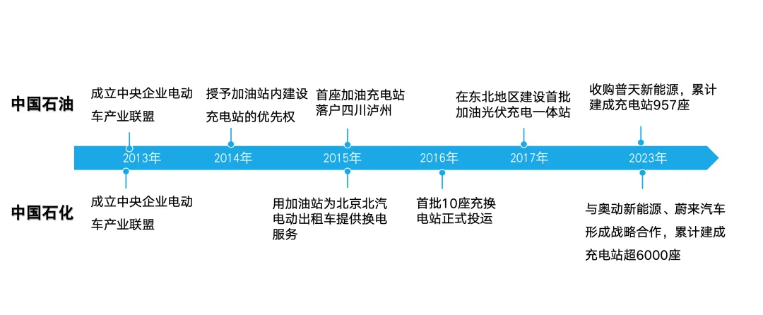 2014年,中國石油授予中國資源交通集團在廣東、河南近2000座加油站內(nèi)建設充電站優(yōu)先權(quán);2015年,油電綜合能源站落戶四川瀘州,可同時為30輛電動汽車提供充電服務;2017年,與普天新能源、大連普達新能源啟動合作,在東北地區(qū)建設首批加油光伏充電一體站。2015年,中國石化與北汽新能源攜手,在北京試運行了第一座充電站,并著手利用加油站為北汽電動出租車提供換電服務;2016年,首批10座充換電站正式投入使用。