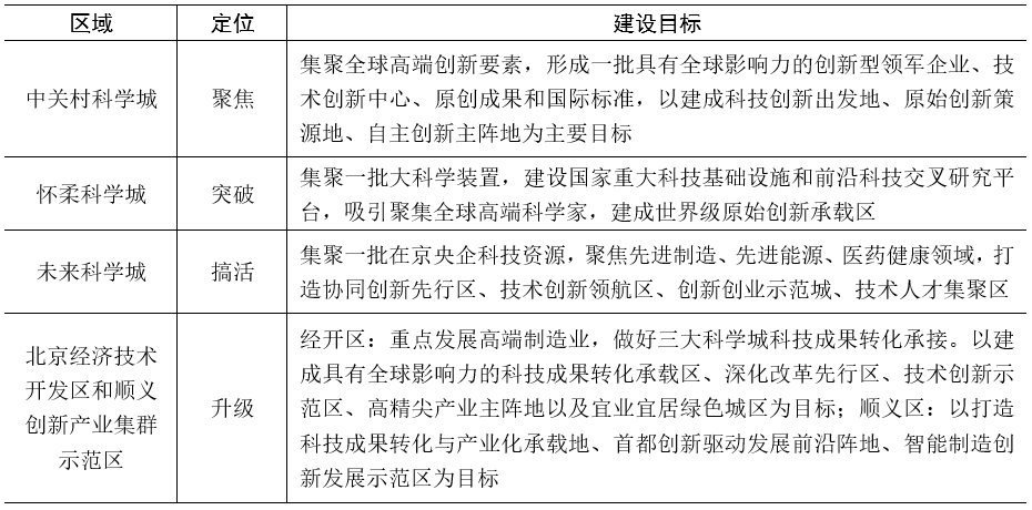 當前我國面臨錯綜復雜的國際形勢,國際科技創新合作面臨巨大挑戰。“三城一區”作為國際科技交流與合作的承載地、國際科技創新中心建設的主平臺,科技創新資源高度集聚,政策疊加優勢尤為突出,加快推動“三城一區”統籌聯動和融合發展,促進各區優勢互補,強化創新鏈、產業鏈和供應鏈協同共生,對北京建設科技創新之城、爭先競逐世界高地意義重大。本文將從“三城一區”融合聯動發展現狀入手,剖析融合聯動發展存在的問題,并研提對策建議,以期為推動“三城一區”融合聯動向縱深發展提供支撐。 一、“三城一區”融合聯動成效初顯,問題仍存 目前,“三城一區”融合聯動發展取得初步成效,協調對接機制初步形成、聯動發展分工定位逐步明確、社會組織驅動聯動合作日益增多,但仍然存在頂層設計亟需優化、協調力度有待提升、優勢互補尚未達成、協同創新合作不足等諸多問題。 (一)組織架構搭建完成,運行機制尚待優化 為支撐北京國際科技創新中心建設,北京市設立“一處七辦”[1]組織架構,北京推進科技創新中心建設辦公室秘書處(以下簡稱“北京辦公室秘書處”)負責北京辦公室日常工作,7個專項辦各司其職,負責具體推進各專項工作,覆蓋重大科技戰略落實、政策創新改革、科技人才建設等重點領域,涵蓋“三城一區”科技創新主平臺。但由于“一處七辦”缺乏實體領導機構,專項辦主要依托相關市屬委辦局、各區政府工作體系運轉,凝聚力有待加強。 (二)協調機制初步建立,協調力度有待提升 北京辦公室秘書處牽頭建立了協調會議機制,包括周例會、季度調度會及半年度調度會等形式,為“三城一區”搭建了溝通交流平臺。“三大科學城”與“一區”簽訂戰略合作協議,各單位相應建立工作專班或領導小組,初步探索建立了聯動發展機制。但“三城一區”尚無市級層面領導機構,聯動層級不夠,工作協調力度不足,不能有效地解決“三城一區”融合聯動發展中出現的深層次問題。 (三)聯動分工初步明確,優勢互補尚未達成 北京市根據“三城一區”創新資源、產業特點、發展方向等方面,明確了“三城一區”具體發展定位及建設目標(見表1),但“三城一區”融合水平尚需提升,目前并未在聯動基礎上充分發揮“三城一區”各自的優勢力量,創新鏈、產業鏈難以形成有效銜接,創新資源優勢尚未充分轉化為產業優勢。 表1 北京市“三城一區”各區域規劃發展定位