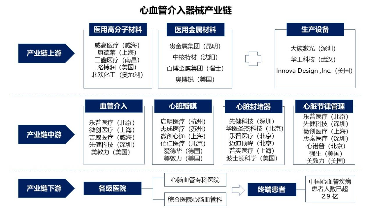 心血管介入器械產(chǎn)業(yè)鏈主要分為三個環(huán)節(jié):