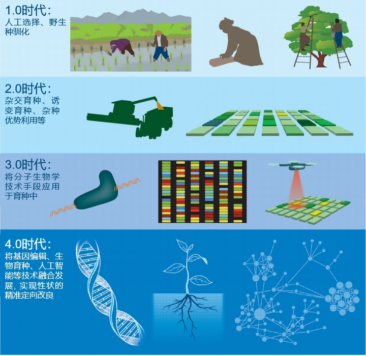 轉基因與全基因組選擇、基因組編輯、合成生物學技術、信息技術、人工智能技術等有機融合,以智能化、數字化育種技術為代表的前沿育種技術在農作物和農業動物中廣泛應用,推動生物育種技術進入“生物技術+信息技術+人工智能+大數據應用”的“4.0時代”。