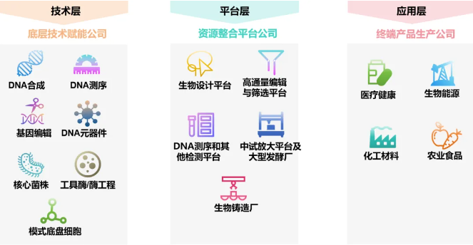 伴隨生物學(xué)、生物信息學(xué)、計(jì)算機(jī)、化學(xué)等學(xué)科的快速發(fā)展,合成生物在經(jīng)濟(jì)社會中加速應(yīng)用滲透,逐步用于加工或合成化學(xué)品、藥品、食品、生物能源等產(chǎn)品,為解決資源短缺、環(huán)境污染等問題提供了新的解決方案。根據(jù)不同類型企業(yè)在合成生物相關(guān)產(chǎn)業(yè)中的不同作用,可以大致將產(chǎn)業(yè)鏈條分為技術(shù)層、平臺層、應(yīng)用層三個層級。