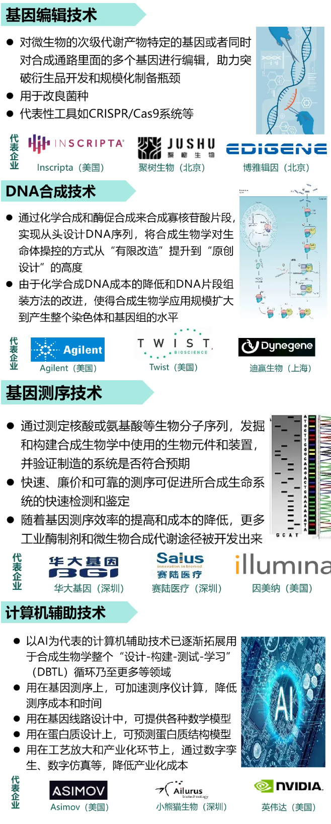 技術(shù)層的主要技術(shù)是指基因合成、基因編輯、蛋白質(zhì)設(shè)計(jì)、細(xì)胞設(shè)計(jì)、高通量篩選等顛覆性使能技術(shù),是支撐和推動合成生物學(xué)發(fā)展的關(guān)鍵。其中,基因組編輯技術(shù)、DNA合成以及基因測序是核心使能技術(shù),此外,計(jì)算機(jī)輔助技術(shù)對合成生物學(xué)的推動作用也日益顯現(xiàn)。