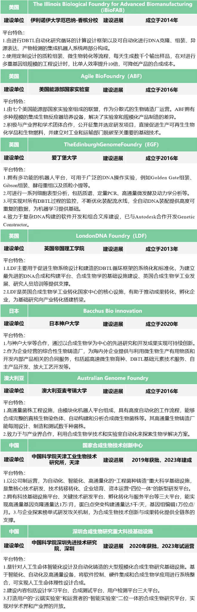 結(jié)合國際合成生物設(shè)施聯(lián)盟(Global Biofoundry Alliance,GBA)成員單位及設(shè)施平臺布局情況,本文重點(diǎn)梳理了全球8個代表性合成生物自動化設(shè)施的建設(shè)及運(yùn)行情況(詳見文后)。