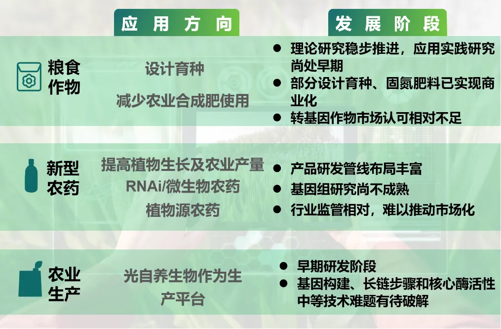 圖2 合成生物技術農業(yè)應用方向及發(fā)展階段