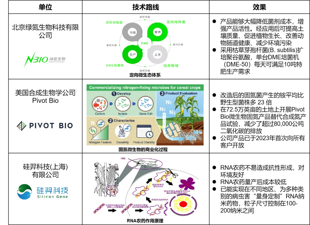 合成生物學技術與農業(yè)領域的結合日益緊密,并在部分方向上已有商業(yè)化成果。目前,農業(yè)合成生物學的基礎研究主要集中在人工細胞合成、細胞工廠、種質改良、二氧化碳固定、生物固氮和農業(yè)環(huán)境優(yōu)化等方面,應用研究主要集中在植物天然產物開發(fā)、農作物性狀改良、病蟲害防控、肥料生產、飼料及添加劑制備等方面,目前能夠或接近實現商業(yè)化的應用主要集中在作物育種、固氮肥料、農藥生物制造等領域。相比之下,生物固碳、生物固氮和代謝途徑改造等仍處于初期概念階段。