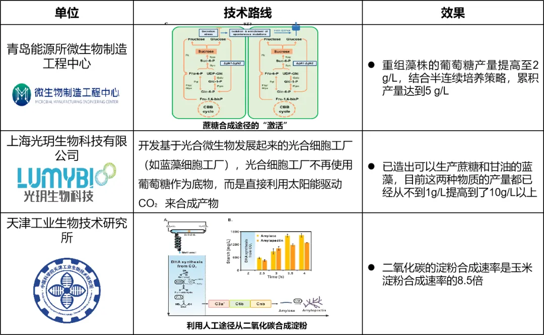 目前國內已有團隊在該領域取得研究進展,如青島能源所微生物制造工程中心實現藍細菌直接利用二氧化碳合成葡萄糖;上海光玥生物科技有限公司改造出可以生產蔗糖和甘油的藍藻;天津工業(yè)生物技術研究所成功實現從二氧化碳到淀粉的人工合成,但基本都還處于實驗室概念驗證階段。