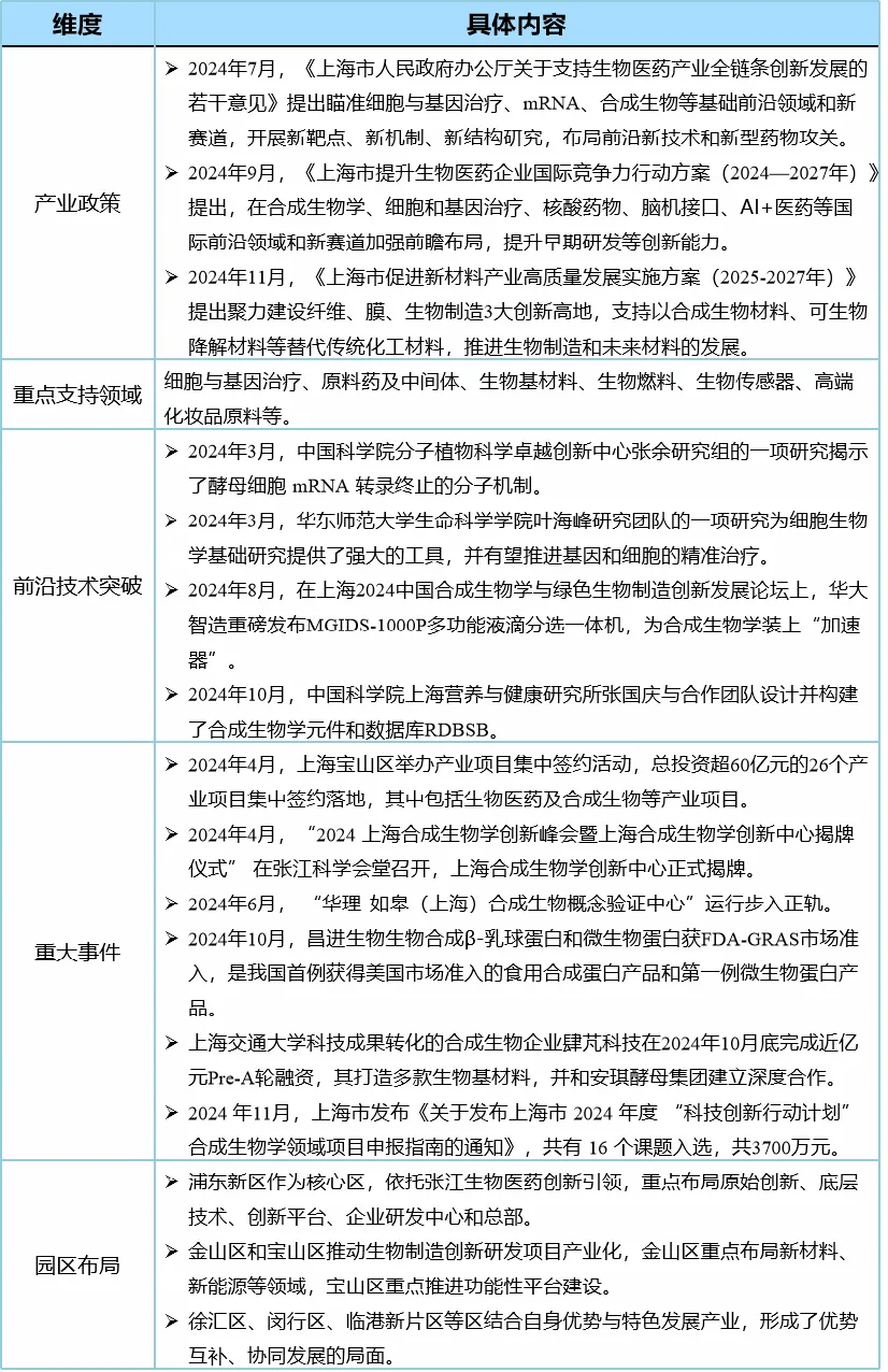 推動優勢前沿領域國際化發展。2024年10月,上海在《上海市提升生物醫藥企業國際競爭力行動方案(2024—2027年)》中提出圍繞合成生物學、細胞和基因治療等國際前沿生物技術領域和新賽道開展前瞻布局,對標國際標準和規范,開發面向國際市場的優質創新產品。2024年11月,出臺新材料產業實施方案支持合成生物材料替代傳統化工材料,支持優先布局CO2制備生物燃料、生物基高分子材料等產業化項目。